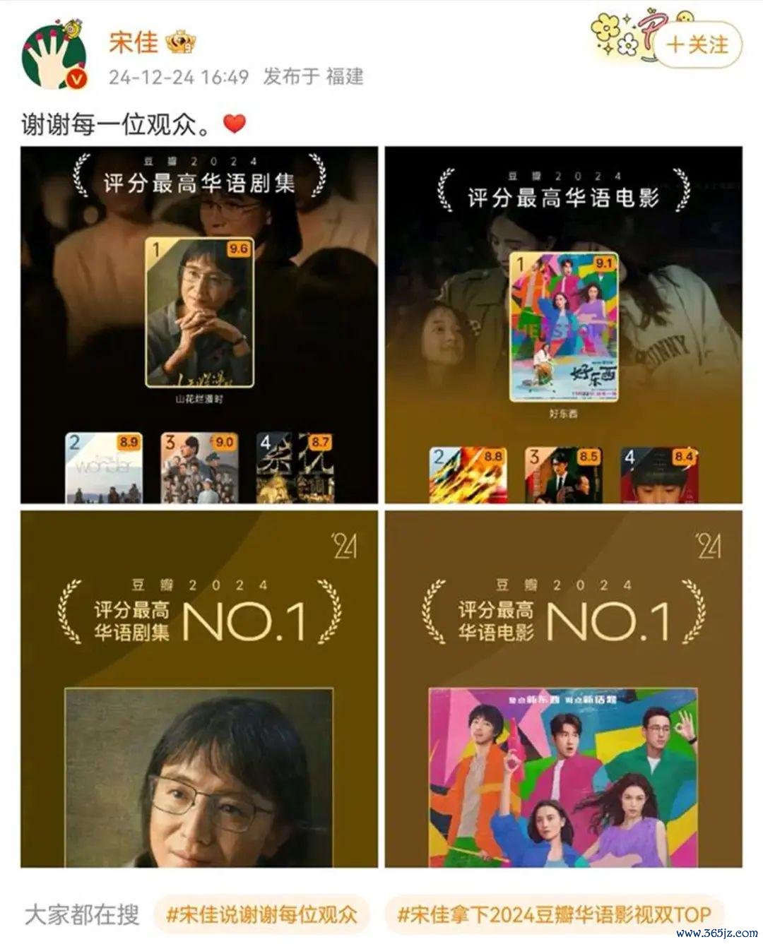 多部作品上榜后,宋佳发文回报:“谢谢每一位不雅众。”